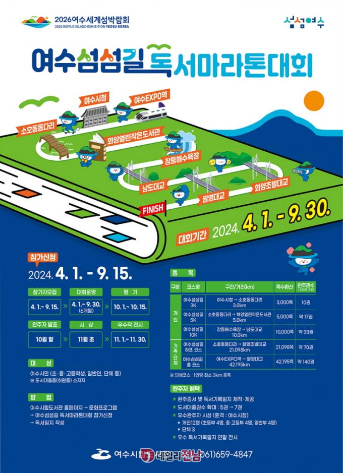 ȸ 㰳 3 ڽ( 3km, 5km, 7km, 10km) ü 2 ڽ( , Ǯ) ȴ. ü ڽ(21.098km) 2~7α, Ǯڽ(42.195km) 2~14α û ϴ.û 4 1Ϻ 9 15ϱ ȸ Ȩ(yslib.yeosu.go.kr/marathon/lib/) , û Ȩ ۼϸ ȴ.